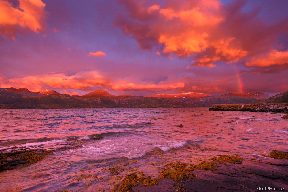 Wir sind am späten Nachmittag in Kilboghavn, ganz knapp südlich des Polarkreises, angekommen. Der Himmel war grau und immer wieder mischte sich leichter Regen unter den stürmischen Wind. Nichts liess erahnen, welches farbenfrohe Schauspiel der Abend für uns noch vorbereitet hatte…