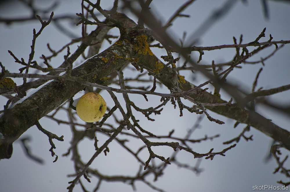 Alle? Nein, denn ein kleiner Apfel klammerte sich noch fest an seinen Ast und liess sich weder vom Wind, noch von der eisigen Kälte beeindrucken.