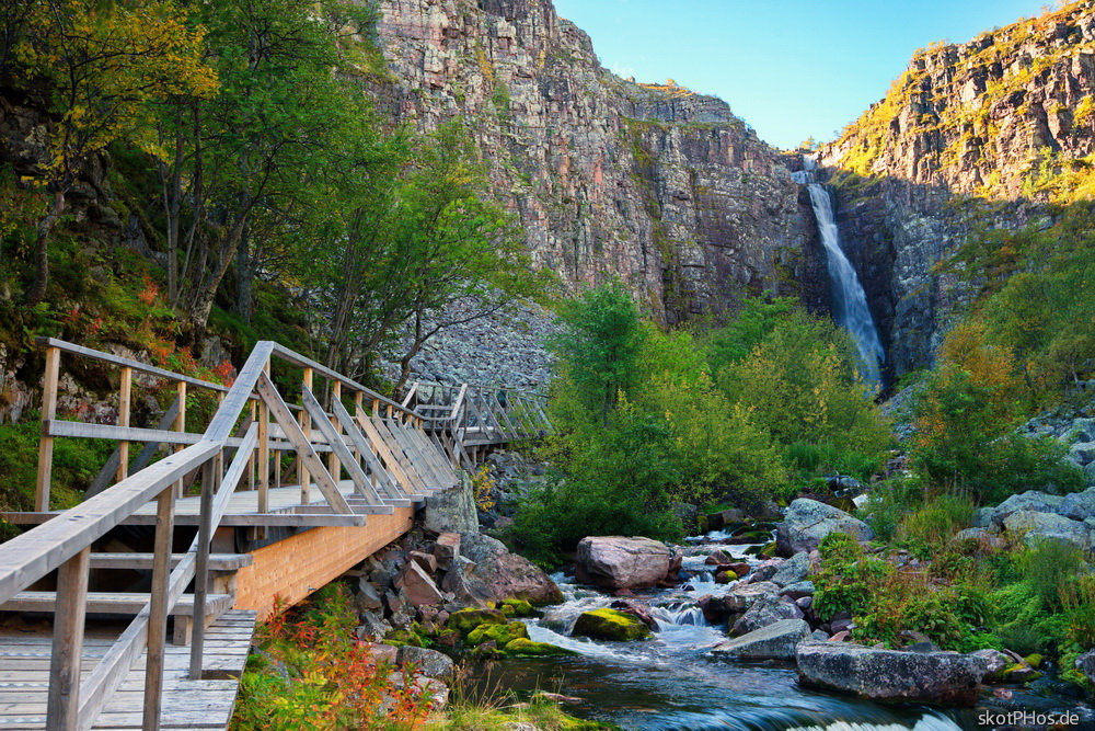 Heute wollen wir noch einmal zum Nupjeskär, dem höchsten Wasserfall Schwedens wandern. Die kleine Tour ist gut beschildert und führt bis an den Fuss des Wasserfalls heran.