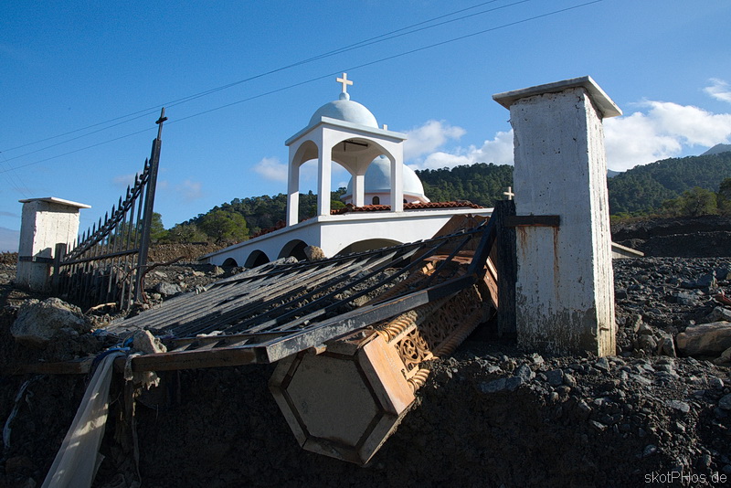 Auf dem Weg nach Psatha kamen wir an einer verschütteten Kapelle vorbei. Eine Lawine hat das Gebäude fast bis unter das Dach mit Schlamm gefüllt. Leider konnten wir nicht herausbekommen, wann dies passiert ist. Wenn man die wenigen durchgeführten Aufräumarbeiten berücksichtigt, scheint es aber noch gar nicht lange her zu sein…